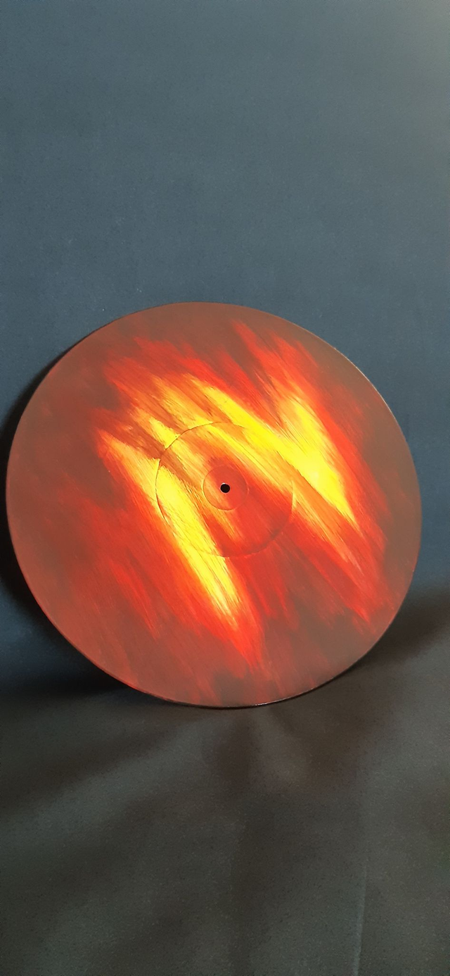 Je vends ce vinyle peint destiné à être un objet de décoration murale ou autre selon vos besoins et votre imagination😊La peinture est de l’acrylique et elle est protégée par une fine couche de vernis de la poussière et des petites rayures potentielles, pas des gros chocs que le vinyle pourrait subir en cas d’incident.